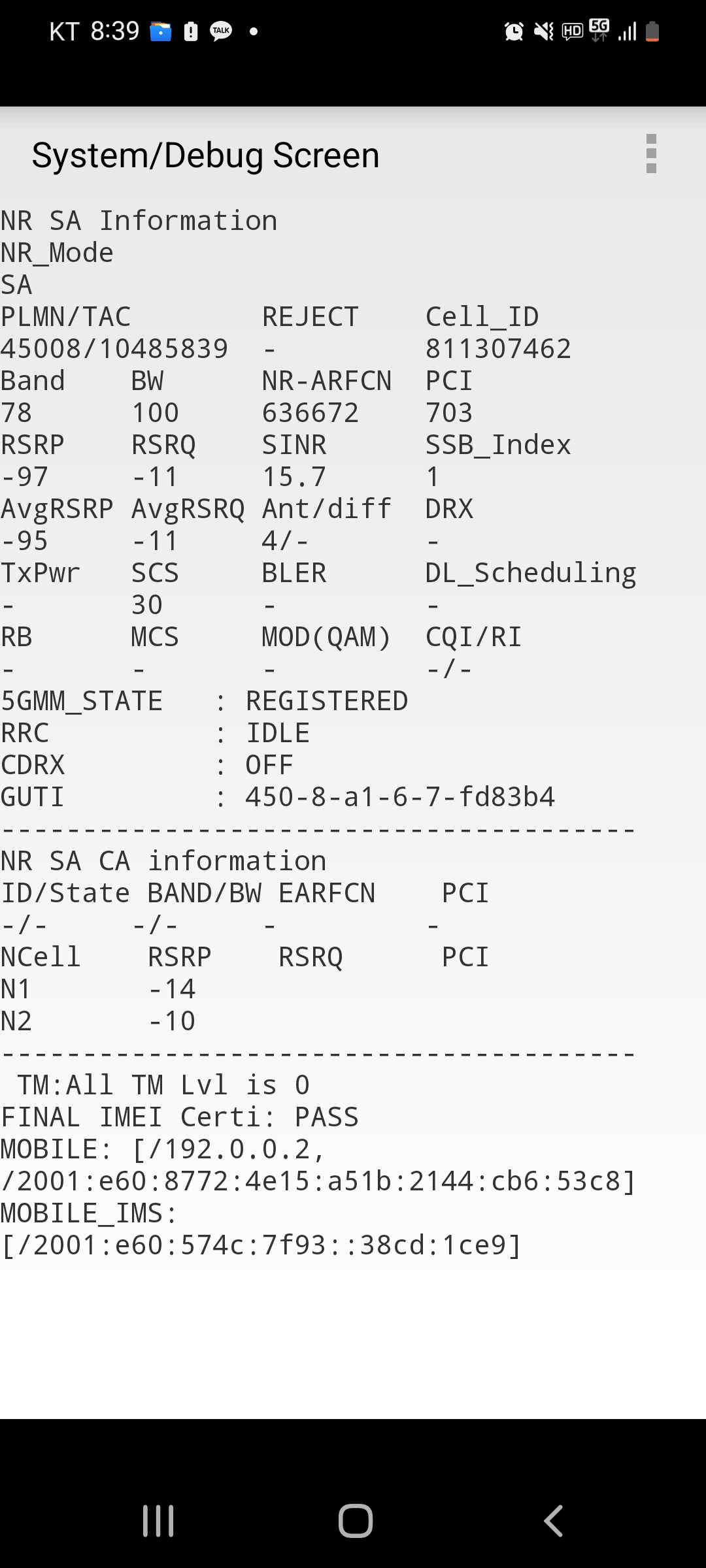 자, 화면 2번째~3번째 줄 보시면 "NR_Mode" 그리고 "SA"가 보이실 겁니다.