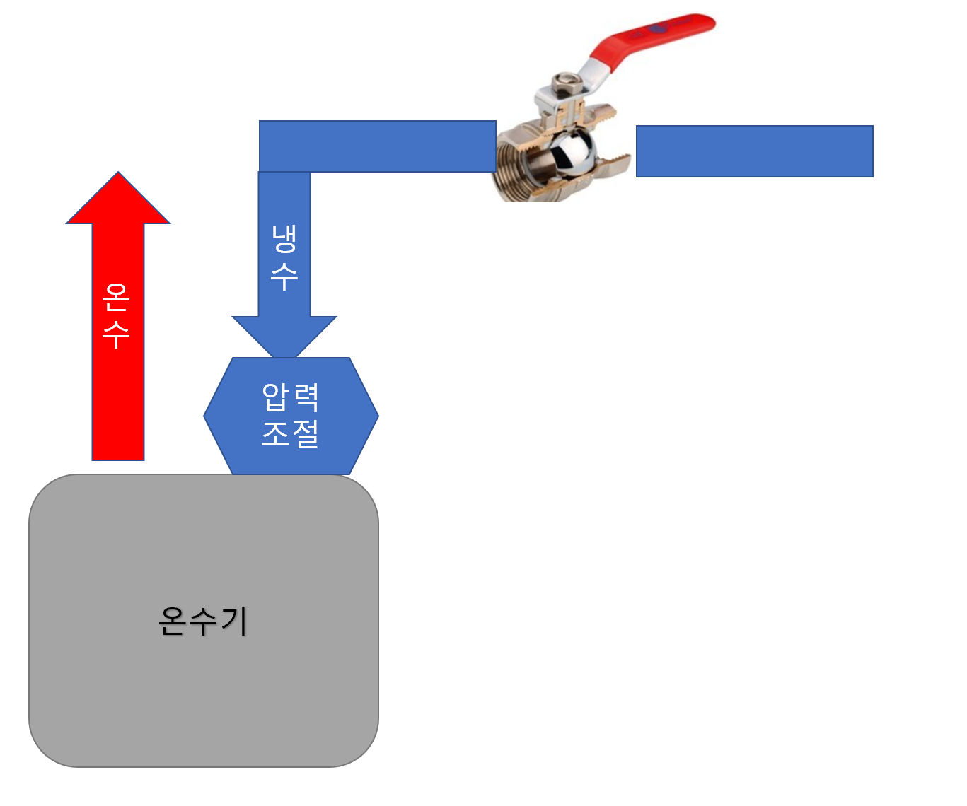 1. 수도관을 통해 들어온 직수가 압력조절을 거쳐 온수기로 들어감