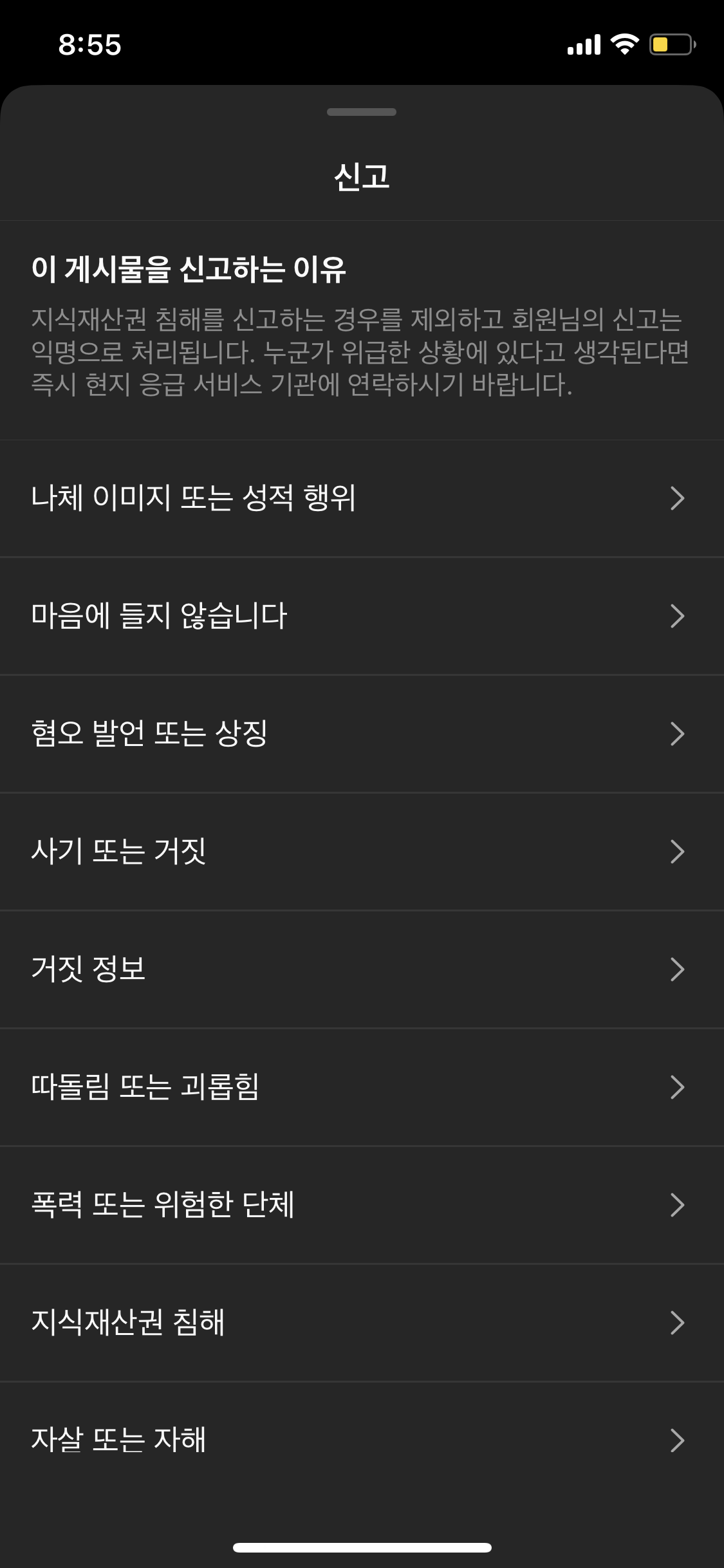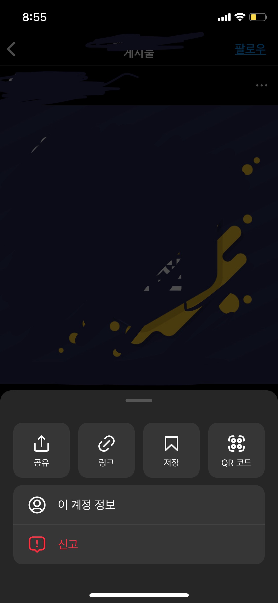 해당 이미지 오른쪽 맨 위에 "점 세개"를 클릭 -> !신고 버튼을 클릭 합니다.