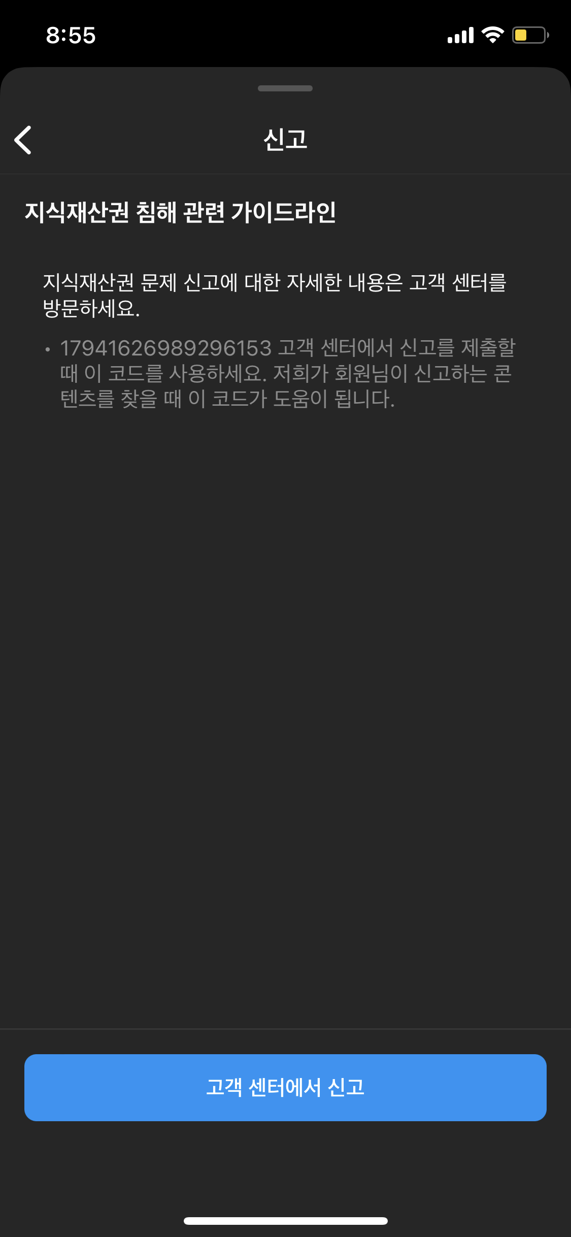 3. 여기서 조금 번거로우시겠지만, "고객 센터에서 신고" 를 눌러줍니다.