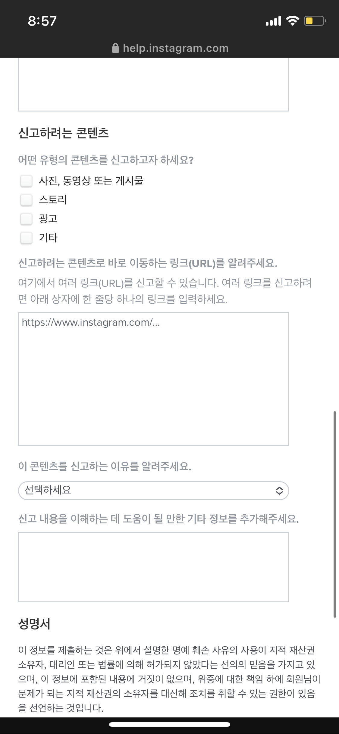URL의 겅우 이전과 같은 방식으로 "신고할 대상 게시물의 URL"을 입력 하시면 되겠습니다.